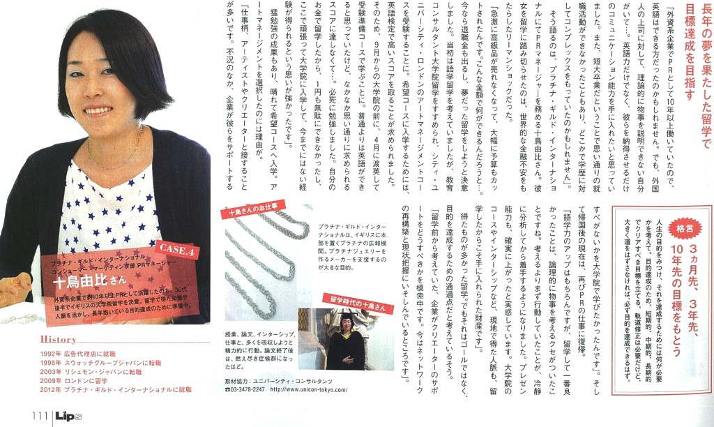 シティ大学の大学院でMA Culture, Policy and Managementコースに留学された十鳥由比さんが、マガジンハウスが発行する大人カジュアルマガジン「Lips」で紹介されています!